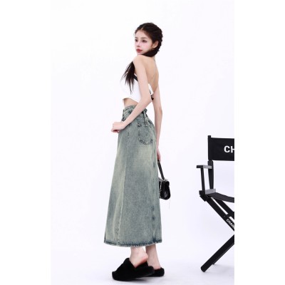 Mid-length denim skirt woman Spring/summer 2021 new thin high waisted slit hip wrap skirt A-line skirt