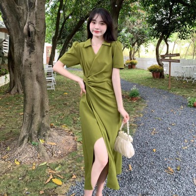 New polo collar dress for summer women's college style aging irregular hem long skirt